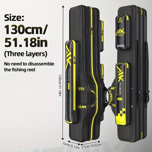 - Dispose de plusieurs couches internes pour un rangement sécurisé de vos cannes, moulinets et petits accessoires.