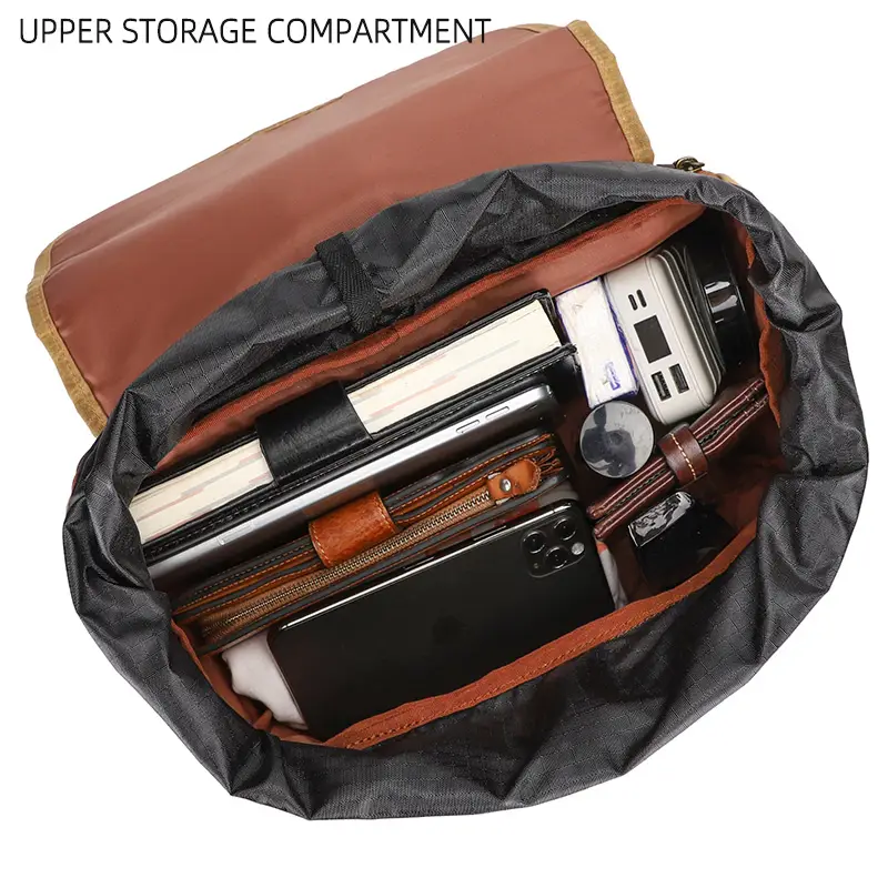 - Conçu en toile cirée épaisse et cuir de cheval fou, il résiste à l’humidité et aux abrasions.