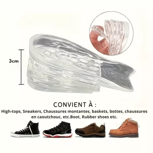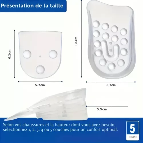 Grâce à leur conception en gel transparent, elles offrent une solution discrète et efficace pour compenser la hauteur selon vos besoins.